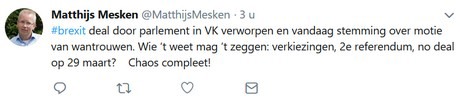 “De chaos is wat mij betreft nu helemaal compleet”, reageert directeur van de VGB Matthijs Mesken. “Het zou allicht het beste zijn als Engeland uitstel kan vragen voor 29 maart. Daarmee is de onzekerheid niet weg, maar is wel tijd gewonnen. Lang niet iedereen heeft zich voorbereid en meer tijd geeft de mogelijkheid ook de achterblijvers en de kleinere bedrijfjes mee te krijgen. Maar hoe dan ook, no deal is voor niemand goed en gaat echt enorme chaos geven.”