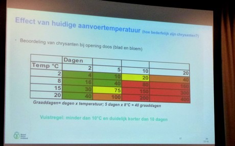 Dat die temperaturen niet best zijn voor de kwaliteit van de bloemen is iedereen wel duidelijk – maar hoe drastisch de gevolgen kunnen zijn werd nog scherper aan de hand van het begrip graaddagen. Een bloem heeft, onder ideale omstandigheden, een x aantal 'levensdagen'. Een chrysant zou in theorie tot 75 graaddagen hebben, maar ieder graadje erbij haalt er daar een aantal vanaf. Zo bleek uit een proef dat bij een bewaartijd van 5 dagen en een temperatuur van 15 graden, een chrysant praktisch aan het einde van zijn latijn is. "De vuistregel is maximaal 10 graden en minder dan tien dagen transport", vervolgt Ten Hoope. “En die grens verbaasde de kwekers. Wat dat betreft kan er aan bewustwording nog veel gewonnen worden.”