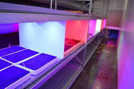 Blik in een van de twee klimaatcellen. Gekeken wordt hoe de jonge planten onder verschillende lichtrecepten - combinaties van rood, blauw en verrood - groeien.