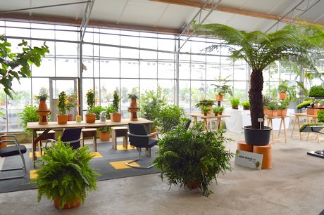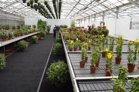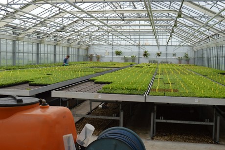 Kijkje in de kas. Op de tafels staan jonge varens