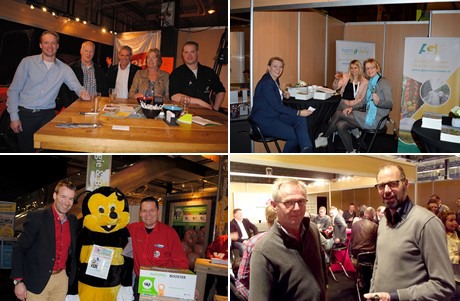 Linksboven: de familie Hopmans met twee bedrijven op de beurs. Rechtsboven: ons eigen geweldige beursteam. Linksonder: Maren Schoormans en Wim Voogt bij Klep Agro, met het te winnen bijenpak. Rechtsonder: ook telers komen langs op de stand.