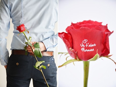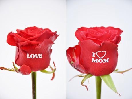 “Het proces gaat als volgt in zijn werk,” vertelt Ramona Fransen, zelf actief bij het project betrokken. “Een klant komt bij ons met een creatief idee of vraagt of ik zelf met een voorstel kan komen. Dat ontwerp ik dan en speel ik hem terug. Zijn wij tot een overeenkomst gekomen, dan laten wij een stempel maken. Dit proces hebben we zelf in de hand dus we kunnen snel schakelen. Op het bedrijf is iemand fulltime aangesteld om vervolgens de rozen te bedrukken. Dat is een arbeidsintensief en secuur klusje: 2000 per dag is wel de max. Op erg drukke momenten, zoals deze periode met Moederdag, kunnen wij de productie tijdelijk opschroeven. Dan huren wij er een tweede machine bij en kunnen zo voor korte tijd dubbele aantallen draaien.”