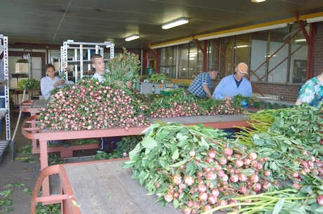 De pioenenteelt is er een van hollen en stilstaan. Vanaf begin mei wordt er geoogst tot juni - begin juli. De precieze tijd hangt van het weer af en is dus altijd weer anders. Wim: “De eerste bloemen komen uit Israël, vervolgens uit Frankrijk en daarna uit Nederland. Nederland is verreweg het beste pioenenland: nergens is het klimaat beter dan hier. Dat weten niet alleen wij, want over de laatste jaren is de productie enorm toegenomen. Ook worden ze wel in de kas geteeld. Die jongens hebben het voordeel dat ze wat eerder, net voor het loskomen van de grote bulk, kunnen leveren. Maar de laatste jaren zijn de winters vrij warm geweest en is het soms lastig een kwaliteitsproduct te leveren. Er moet kou overeen. De mooiste pioenen,” lacht Wim, “komen toch van het land.”