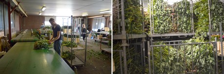 In de verwerkingsruimte (links) en de pioenen in de koelcel (rechts)