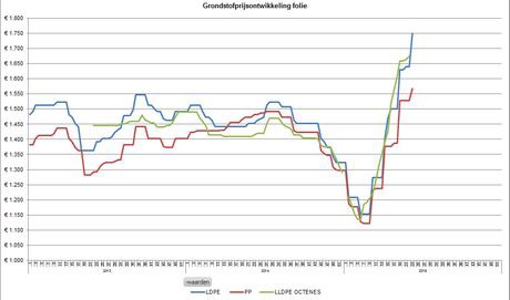 De prijzen voor de grondstoffen zijn doorgaans redelijk stabiel, hoewel de prijs wel meebeweegt met de olieprijs. Toen een vat olie eind vorig jaar flink goedkoper werd, vertaalde dat zich in een dalende prijs voor de plastics grondstoffen. In de eerste week van 2015 stond de prijs op 1325 euro om daarna te dalen tot het dieptepunt 1150 euro.