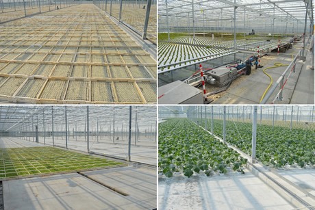 Beelden uit de kassen: links boven en onder zijn de perspotten te zien, rechts boven sla op water, recht onder jonge komkommerplanten.