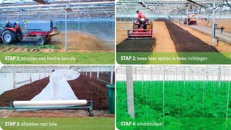 Misschien wel de grootste uitdaging zit hem in het goed afdekken van de grond. Er mag immers (bijna) geen zuurstof bijkomen. Daartoe maakt Thatchtec, het bedrijf achter Bodem Resetten, gebruik van zuurstofdichte folies. Ook de grondbewerking speelt soms een cruciale rol. Juist op veengrond, maar in toenemende mate ook op zandgrond worden spitmachines toegepast met een extra hydraulisch aangedreven gladde rol. Zodat de Herbie korrels, net als zaad, met name in de toplaag, goed opgesloten en nat worden, wat voor de bacteriën nodig is. En de toplaag meer vocht van onderaf krijgt, waardoor het effect op onkruid en ziekten in de toplaag verbetert. Bovendien warmt de grond beter op doordat de ingestraalde zonnewarmte makkelijker naar beneden wordt geleid. “In de praktijk allemaal niet ingewikkeld, en de ervaring leert dat telers steeds beter onder de knie krijgen.”