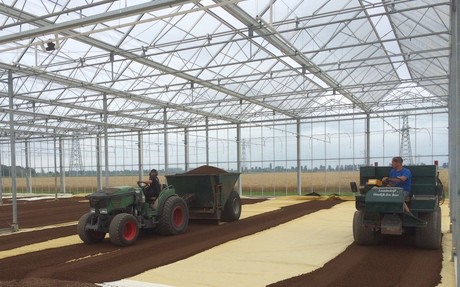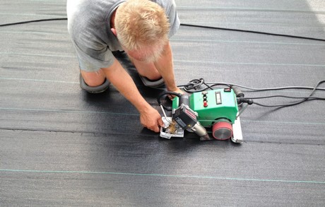 Doeken worden aan elkaar geseald bij Kwekerij Sonneveld in Honselersdijk.