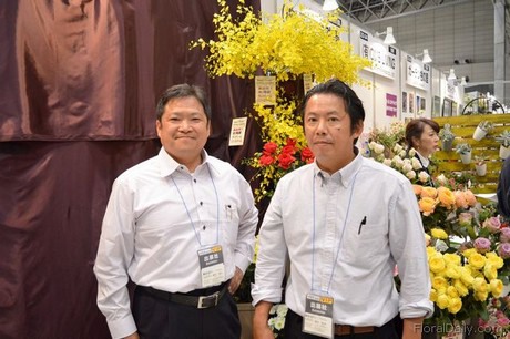 Atsuhiro Kushida en zijn broer op de IFEX in Japan. Zij tonen enkele van hun geïmporteerde bloemen.