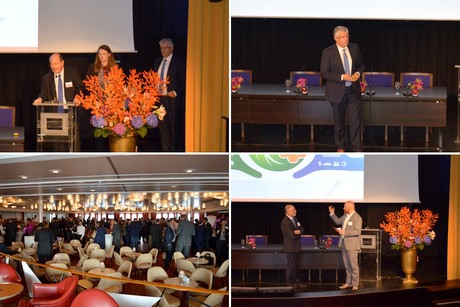 Vlnr, mee met de klok: Robert Roodenburg (voorzitter VGB), Theo de Groot (CEO MPS), Karl Raats voelt Richard Fox (FSI) aan de tand en een kijkje in de luxe balzaal van de SS-Rotterdam