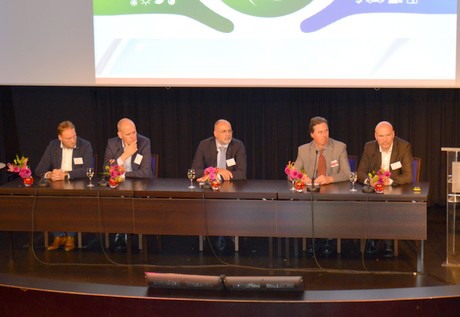 In de panel discussie, vlnr, Marcel van Hoeven (CEO Van Dijk Flora), Rens Buchwald (CFO FloraHolland), Leon Mol (Ahold), Daniel Velez (CEO Suasuque) en Alexander Zoern (CEO Blume2000).