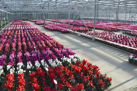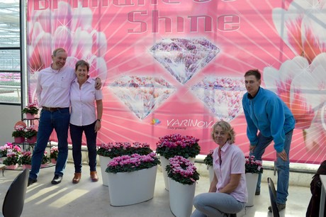 Een van de hoogtepunten op de trials is de Shine. De Shine kleuren komen in diverse Cyclamen variëteiten beschikbaar en kenmerken zich door een brede witte bloemrand. Carolien Klein, office manager bij het bedrijf: “We hadden al een aantal Shine rassen meegenomen naar de Trade Fair, twee weken terug in Aalsmeer, maar op de IPM in Essen, begin volgend jaar, is het de bedoeling dat zij echt zullen ‘shinen’. Onder de Shine vallen verschillende variëteiten, zowel geschikt voor binnen als buiten, waaronder bijvoorbeeld ook de Goblet. Deze heeft als bijzondere eigenschap dat de blaadjes niet, zoals bij Cyclamen gebruikelijk is, recht omhoog groeien, maar daarentegen meer naar buiten toe, wat de plant weer een andere, nieuwe uitstraling geeft.”