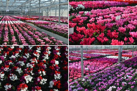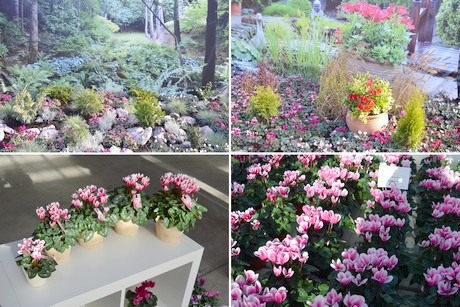 De bovenste twee foto's zijn buiten genomen. Aldaar waren verschillende cyclamen in het perk gepland met daarachter doeken met tuinen erop afgebeeld. Onder: de Picola Shine Red, in vijf potmaten (links).