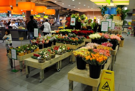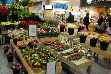 Er staan een aantal fraaie phalaenopsissen, een paar kerststerren en opvallend genoeg, in een supermarkt, ook een aantal kamerplanten uit het hogere segment met een vraagprijs van rond de 70 euro. Het belangrijkste voor de omzet echter, vertelt Sevenstern, zijn de snijbloemen. Niet alleen de Duitse klanten nemen ze mee, maar ook de Zwitsers die vaak boodschappen komen doen bij Edeka Baur zijn bij de bloemenshop goede klanten.