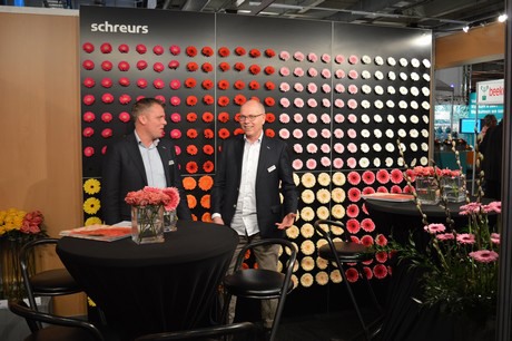 Edwin van Dop en Willem v/d Berg van Schreurs, staande voor de altijd weer indrukwekkende gerbera-wand.