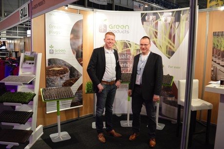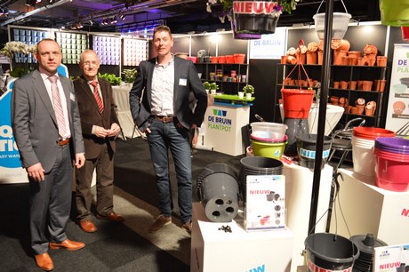 Everard de Bruin, Jan de Bruin en Ted Verbraeken van De Bruin Plantpot. Het bedrijf had verschillende noviteiten te melden, waaronder een pot met ventiel en extra waterbuffer, uitermate geschikt voor transport (op de voorgrond).