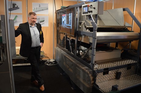Herman van der Jagt van Hans van der Poel, hier bij de semi-automatische leliepotmachine. Hiermee kunnen 2 man in een uur 6200 bollen potten.