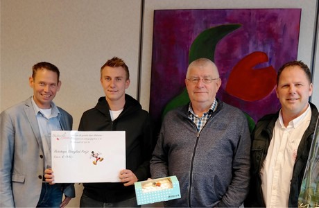 Hans Bok (links) en Chris Biesheuvel (rechts) overhandigen een reischeque t.w.v. 1500,- voor Disneyland Parijs aan Jens Kralt en Jos Geelings