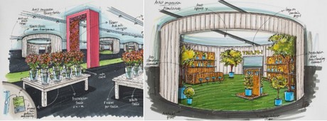 Op het linker plaatje de display tafels met dezelfde bloemensoort van verschillende kwekers en op het rechter plaatje een voorbeeld van een stand. Het uiterlijk is hetzelfde als de andere stands, maar de inrichting is naar gelang van de standhouder.