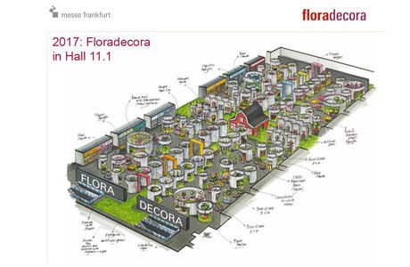 Floradecora zal plaatsvinden in Hall 11.1, en heeft een grootte van ongeveer 12.000 m2. De lay-out van de stands verschilt van reguliere beurzen omdat deze er van buiten er allemaal gelijk uitzien, ze verschillen alleen in grootte. "De standinrichting is natuurlijk aan de standhouders zelf, maar van buiten zijn alle gelijkwaardig." Belangrijk is dat de verse bloemen en planten centraal staan. Op verschillende tafels op de beursvloer zullen dezelfde productsoorten van verschillende kwekers tezamen gepresenteerd worden. "Als een koper bijvoorbeeld zoekt naar witte rozen, dan vindt deze koper het hele assortiment van witte rozen van de verschillende kwekers op een display tafel tussen de stands. Aan elke vaas van elke roos hangt een label met daarop de naam van de variëteit, de bloeiperiode, de beschikbare kwantiteit, de naam van de standhouder en het stand nummer. "We brengen eerst de schoonheid van de verse bloemen en planten onder de aandacht van de bezoekers, daarna begeleiden we de kopers naar de aanbieders en kwekers." De beursorganisatie zal de tafels indelen en zal de verantwoording dragen voor het bijhouden en op tijd vervangen van de bloemen/planten.