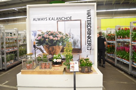 Naast het zo goed beantwoorden aan de vraag van de klant, ondersteunt Waterdrinker ook diens leveranciers. Zo biedt de exporteur in de eigen winkel kwekers de ruimte de eigen producten aan de te prijzen en te inspireren met toegevoegde waarde. "Een dergelijke presentatie (zoals voorbeeld hieronder een foto van Kalanchoe) staat doorgaans een week of vier, waarna het tijd is voor een andere presentatie van een andere kweker."
