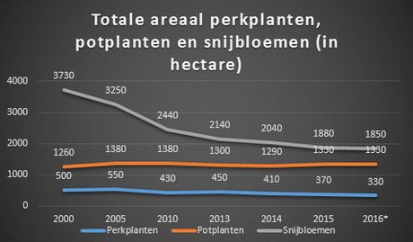 Deze figuur spreekt voor zich: met name snijbloemen is over de jaren gedaald. Rozen, maar ook andere snijbloemen, hebben te maken gekregen met meer (Afrikaanse, Zuid-Amerikaanse) concurrentie. Pot- en perkplanten zijn echter onverminderd stabiel.