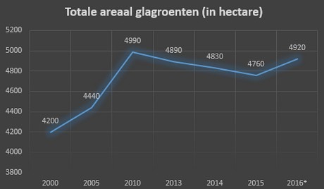 Dat laatste, die paar slechte jaren, tonen zich ook in het areaal glasgroenten. Toch heeft men in deze sector de weg naar boven weer gevonden: veel nieuwbouw en schaalvergroting en tegelijkertijd weinig faillissementen zijn de voornaamste verklarende factoren.