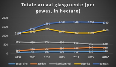 Het areaal glasgroenten lijkt t.o.v. vorig jaar weinig te zijn veranderd met één grote, reeds genoemde uitzondering: de paprika.