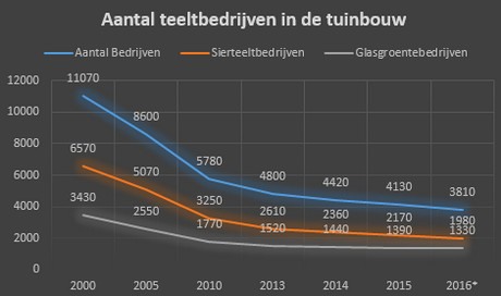 In de figuur het totale tuinbouwareaal. Niet alleen treedt er een schaalvergroting op (daarover zegt de grafiek overigens niets), het areaal neemt ook wel degelijk wat af. T.o.v. 10 jaar geleden met ruim 1000 ha.