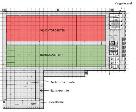 serre wordt ongeveer 6000 van de 8000 m² ingenomen door teeltcompartimenten. Een rij compartimenten voor bladgroenten (groen vlak in de schets) wordt door een technische corridor met vooral dagvoorraden voor de voedingsoplossingen, gescheiden van een rij compartimenten voor vruchtgroenten (rood vlak in de schets). Op vraag van de telers zijn enkele grote compartimenten voorzien van ongeveer 700 m², representatief voor de praktijk naast enkele kleinere compartimenten. Substraatteelt
