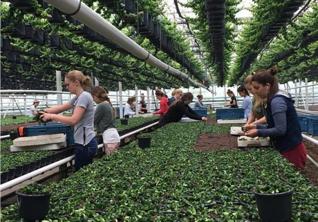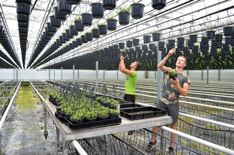 Schouten werkt met vijf vaste krachten en werkt daarnaast graag met scholieren. "Op zaterdagen en in de vakantie wel drie ochtenden in de week, hebben we er hier zo'n vijftig lopen. De meisjes doen het oppotten, de jongens hangen de planten aan de buizen."