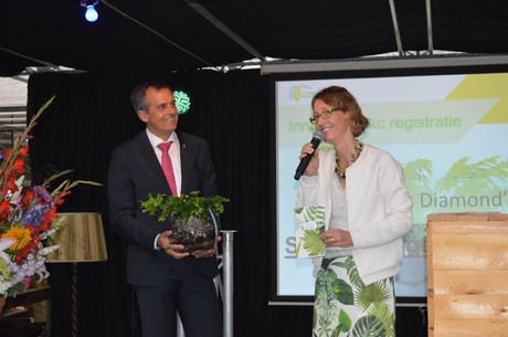 Dewi Hartman, SIGN, verraste Nico. Een aangename verrassing. Vitroplus komt met een nieuwe varen op de markt. Deze varen is naar Nico vernoemd: Nicolas Diamond. Met een druk op de grote rode knop onthulde de voorman de naam.