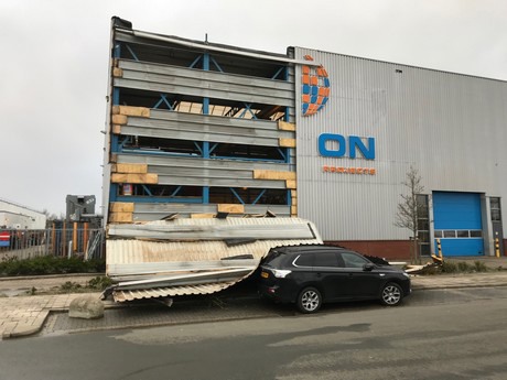 De zware storm heeft het vooral op bomen en bedrijfspanden gemunt. Een stuk van de gevel is er door de zware storm uitgewaaid en op een geparkeerde auto gevallen. "Er zijn geen gewonden gevallen, maar het was wel even schrikken", bevestigt Olaf.