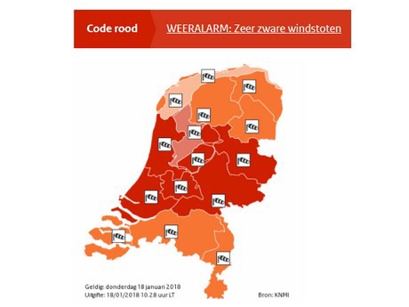 In de provincies Zuid-Holland, Noord-Holland, Utrecht, Flevoland, Gelderland, Overijssel en het IJsselmeergebied is code rood van kracht voor zeer zware windstoten van 110-130 km/u, lokaal mogelijk 140 km/u. In de overige gebieden worden iets lagere waardes verwacht van 100-120 km/u en is er code oranje van kracht. In de tweede helft van de middag neemt de wind sterk in kracht af. De wind komt uit west tot noordwest.