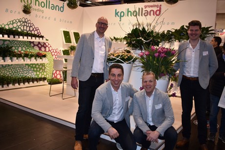 Team van KP Holland, dat enkele noviteiten presenteert: een nieuwe spathiphyllum, de oranje kalanchoƫ Rosalina en de roze curcuma Siam.