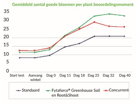 “Root & Shoot is een uniek product ”, vertelt David Damminga van Soiltech. “Het is een vloeibare meststof die de wortelgroei en scheutontwikkeling stimuleert en ook als hulpmiddel fungeert in stresssituaties zoals vorst, hitte en verplanting. Fytaforce is een vloeibaar product dat een enorme diversiteit aan nuttige schimmels, bacteriën en protozoa bevat waardoor vooral de bodemweerbaarheid wordt verhoogd. In deze proef maakten we gebruik van een speciale variant voor de glastuinbouw, Fytaforce Greenhouse Substrate.”