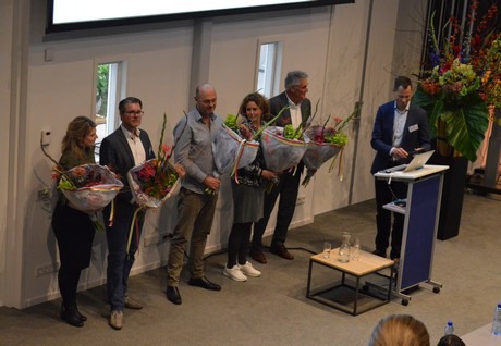 De sprekers werden getrakteerd op een bloemetje. Vlnr: Esther de Waard, Ivo van Orden, Roel Schoenmaker, Simone Dussine-Leijten en Henk Spoon. Uiterst rechts Dennis van der Lubbe