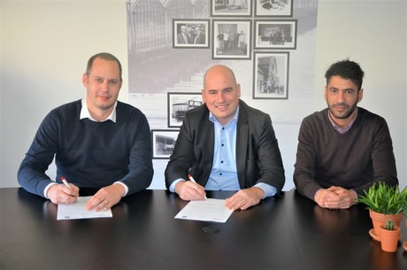 Royal Brinkmans inkoopdirecteur, Ramon Verdel, Hygeniqs commercieel directeur Mario Bussink en Gai Vegter, productspecialist bezegelen de samenwerkingsovereenkomst.