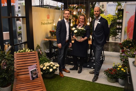 Erik Bos, Anneke van Pelt en Peter van der Ham van Nolina. Anneke heeft het nieuwe potroosje 'Michala' vast, een variƫteit met extreem grote bloemen (veredeld door Poulsen)