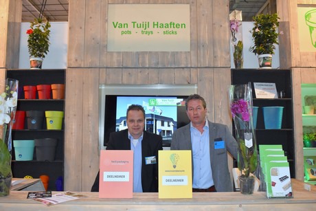 Nico den Hertog en Frits van Duijn stonden weer paraat voor een ieder die wat wilde weten van de producten van Van Tuijl Haaften, Pots-Trays-Sticks