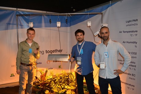 Sigrow voor een opstelling met diverse draadloze sensoren waarmee telers kunnen begrijpen wat er met de plant gebeurt, het microklimaat rond de plant kunnen meten en ook het kasklimaat nauwkeurig in beeld kunnen brengen. Op de foto: Paul Ruigrok, Javier Lomas en Juan Carrascosa.
