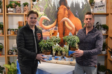 Tjen de Groot en Petri Brekoo van Kwekerij De Groot, die hier trots het 'Ice Age plantje' presenteren.