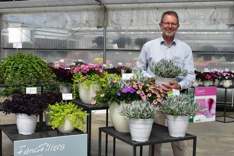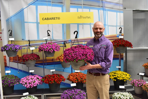 Jason Twaddell van Ball FloraPlant met de calibrachoa Caberet Good Night Kiss, een nieuwe varieteit in Caberet series. Naar eigen zeggen bloeit de plant wanneer de dagen tenminste 11 lichturen hebben, en blijven de bloempjes ook in het schap, waar doorgaans minder licht bijkomt, mooi.