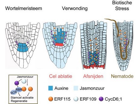 Na verwonding van scheuten of wortels produceren planten de signaalstof jasmonzuur. Tot nu toe werd gedacht dat deze stof voornamelijk diende om chemische afweer tegen indringers zoals insecten en nematoden (parasieten die plantenziekten veroorzaken) te stimuleren en om groei te onderdrukken. Het werk van Wageningse onderzoekers laat zien dat jasmonzuur via een nieuwe signaalroute communiceert met de plantaardige variant van het retinoblastoma eiwit en dat deze route van belang is tijdens de groei van wortels in de bodem en voor interactie met nematoden.