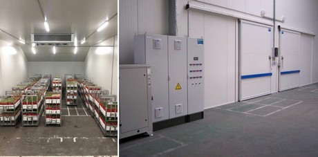 Links een foto met de tulpen in de koelcel van Air.clima, rechts een blik op de celdeuren.