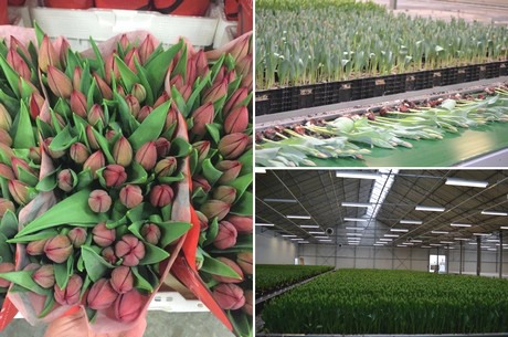 Tulpen klaar om de deur uit te gaan en rechts een blik in de kas en tulpen die geoogst worden.