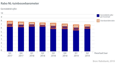 De Rabo Tuinbouwbarometer komt in het eerste kwartaal van 2019 uit op 6,5. Dat is een behoorlijke daling ten opzichte van het vierde kwartaal van 2018 (6,8). Dat is te wijten aan de gevolgen van extreme weersomstandigheden én de resultaten voor jaarrondteelten zijn in het huidige cijfer meegenomen. Hoewel de barometer is gedaald in de loop van 2018, was het over het algemeen toch een jaar met een redelijk rendement. Ook de exportcijfers stijgen, mede door de re-export. Vergeleken met 2017 bleef de export van groente (6,6 miljard euro, -0,2%) stabiel. De export van fruit (6,0 miljard euro, +8,5%) en sierteelt (9,2 miljard euro, +3,3%) stegen.
