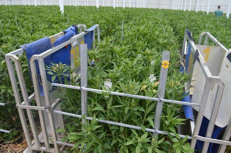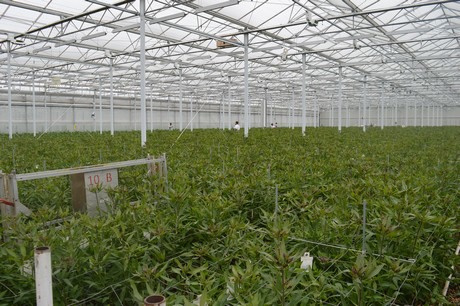 Blik in het nieuwe gedeelte, dat gebouwd is direct achter een van de hoofdlocatie (aan de overkant van de weg liggen nog twee kleinere productiekassen).