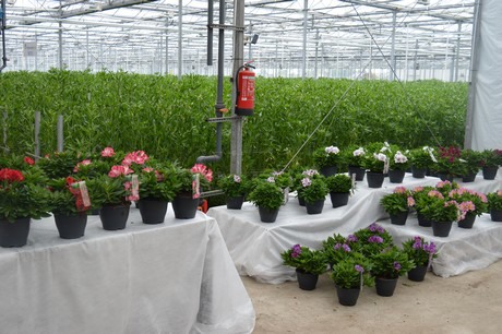Niels Tesselaar en Mark Kuiper tussen de bloemetjes vóóraan in de kas. Hier staan een paar bedden, waarop men de nieuwste variëteiten test en laat zien.