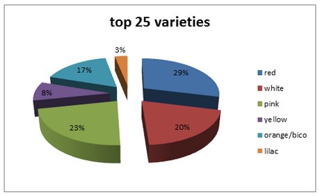 Ook bij de veiling van FloraHolland heeft oranje een belangrijk aandeel. "Als we kijken naar de top 25 variëteiten bij Royal Floraholland, zien we dat oranje de op drie na belangrijkste kleur is met een aandeel van 17 %, zegt Aart Buizer, verkoopmanager bij Fresco Flowers, een bedrijf dat bloemen verpakt bij Royal FloraHolland in Aalsmeer en Rijnsburg. Het bedrijf controleert, verpakt en levert bloemen van verschillende Keniaanse rozentelers.